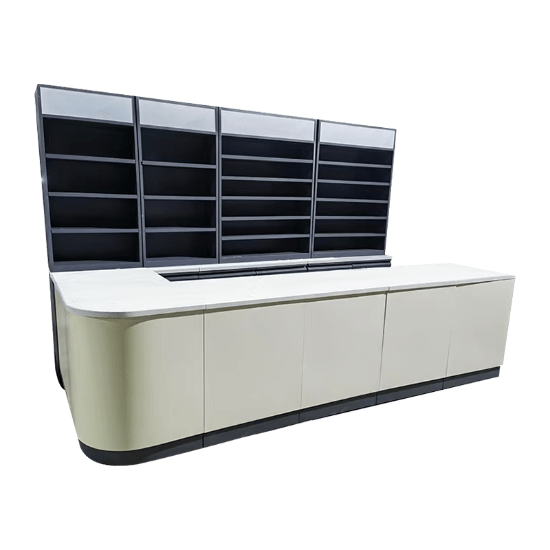 Hieno muotoilu, erittäin ergonominen, saa asiakkaat tuntemaan olonsa mukavaksi ja mukavaksi kassalla. Työtaso on tilava ja tasainen, joten kassanhoitajat voivat nopeasti skannata koodeja ja maksaa tilit sekä asiakkaat voivat sijoittaa tilapäisesti ostamiaan pieniä tavaroita, kuten purukumia, minttuja ja muita impulsiivisia kulutustavaroita.