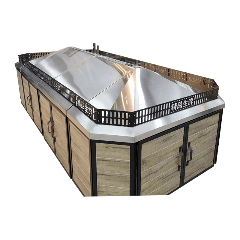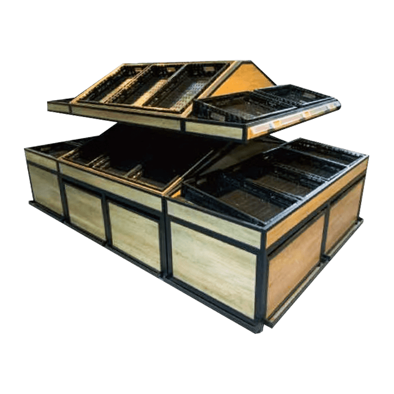 Tämä järeä ja kestävä hedelmä- ja vihannesteline on valmistettu erittäin lujasta metallista yhdistettynä korkealuokkaiseen puuhun, mikä tarjoaa poikkeuksellisen kantokyvyn ja kestävyyden. Se on suunniteltu korkean taajuuden ja suurien tuotantomäärien varastointiin, joten se sopii erinomaisesti supermarketteihin ja tuoremarkkinoille, joilla on paljon liikennettä. Sen tukeva rakenne takaa pitkäaikaisen vakauden ilman muodonmuutoksia, jopa jatkuvassa käytössä.